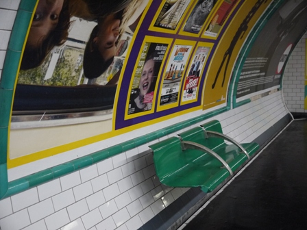 Seating is in the form of a green metal bench dividing it with curved silver armrests into three seats. It is fixed to the wall.
