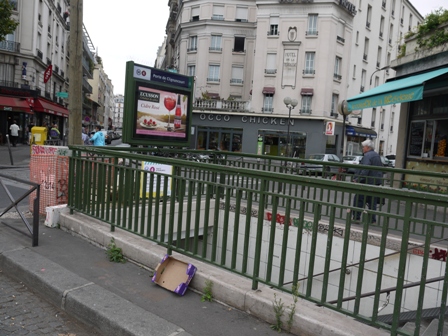 On top of the back is the station sign in a green metal box. Next to the name is the number of the metro line. Below is a glass panel with revolving advertissements.