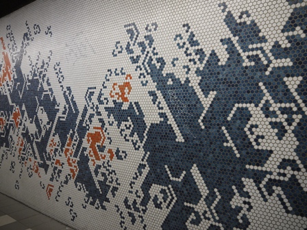 The name of the station printed on blue tiles and two patterns have been integrated in the frame.