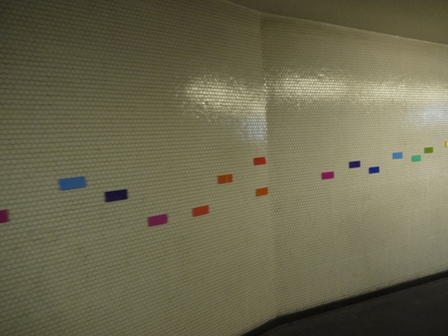 The advertising frames in the corridor are surrounded by honey-coloured ceramic tiles. Their tops curve slightly on the painted part of the wall.
