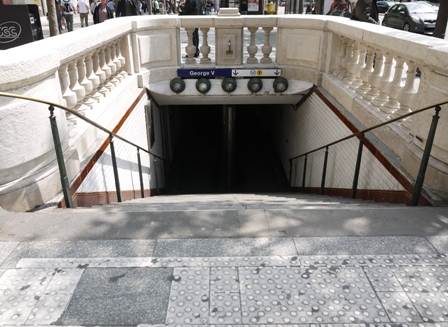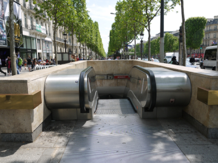 The entrance of this station is on the upper parts of the Champs-Elysées. It is surrounded by a beige stone ballustrade designed by Marie-Joseph Cassien Bernard. At ground-level, at the back of the entrance, is a small plasticized blue sign with the station name and another white one with the number of the metro line.