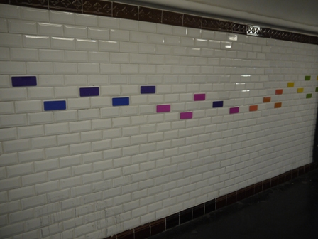 The advertising posters have been added to metal-framed boards on the curved walls. The little tiles are all the way to the ground, there is no row of border tiles.