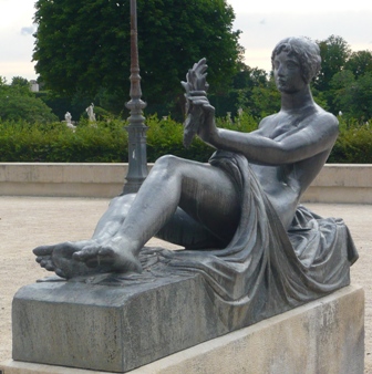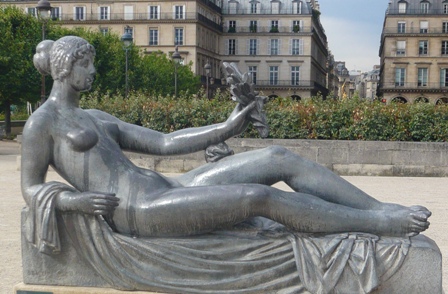 Statue of a woman lying on a sheet holding a plant in Jardin des Tuileries.